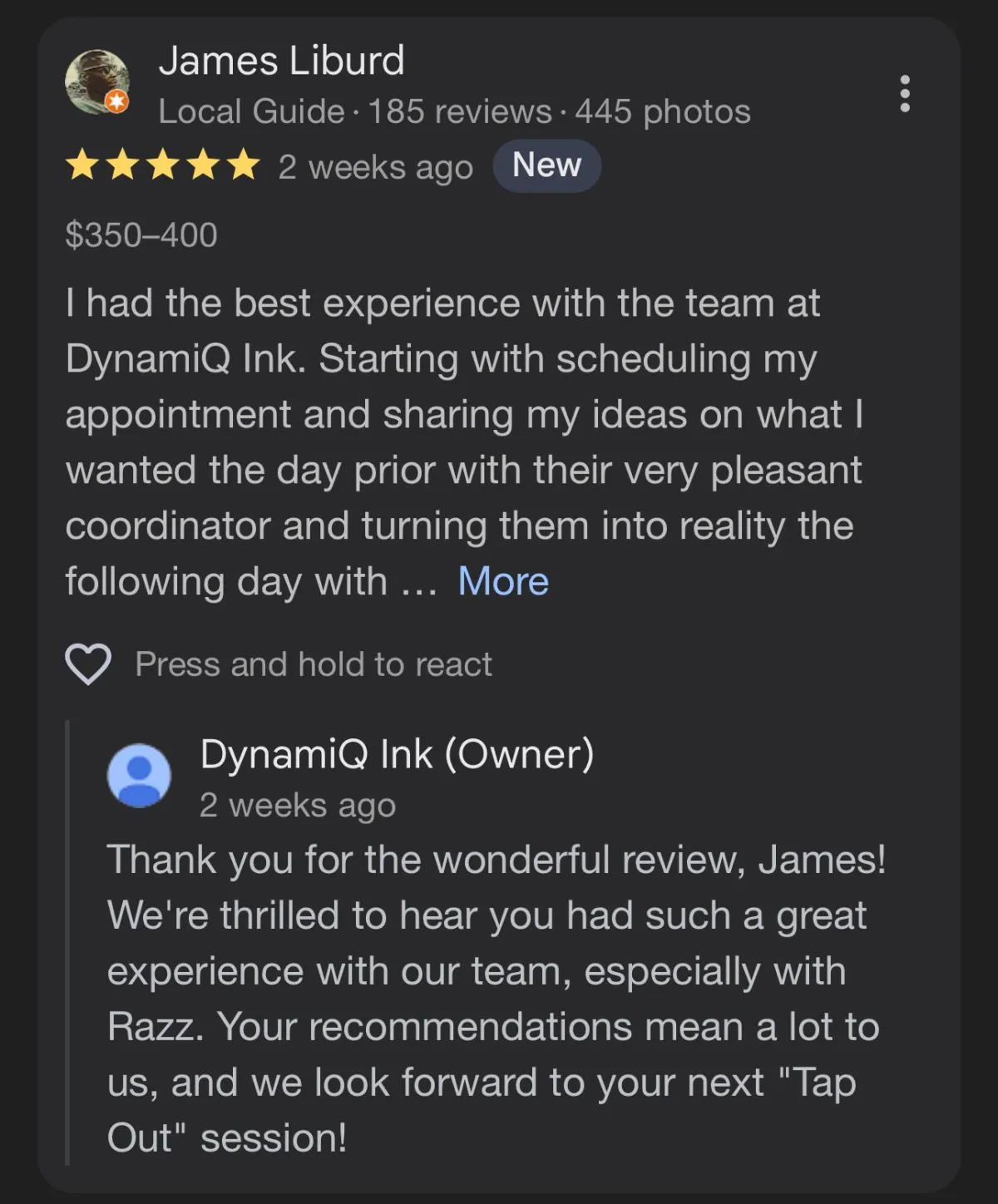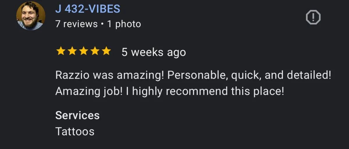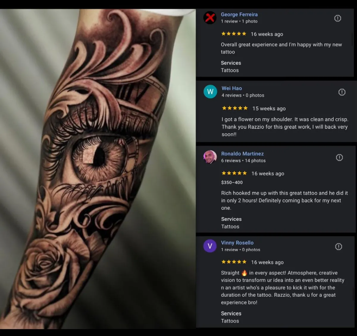 With over a 5 Years of professional experience and more than 1,000 tattoos completed, Razzio has established himself as a high functioning , Amazing tattoo artist. His exceptional talent has earned him invitations to multiple exclusive Arts conventions Selling his high end, Commissioned art, where only the industry's elite artists are welcomed to showcase their work.